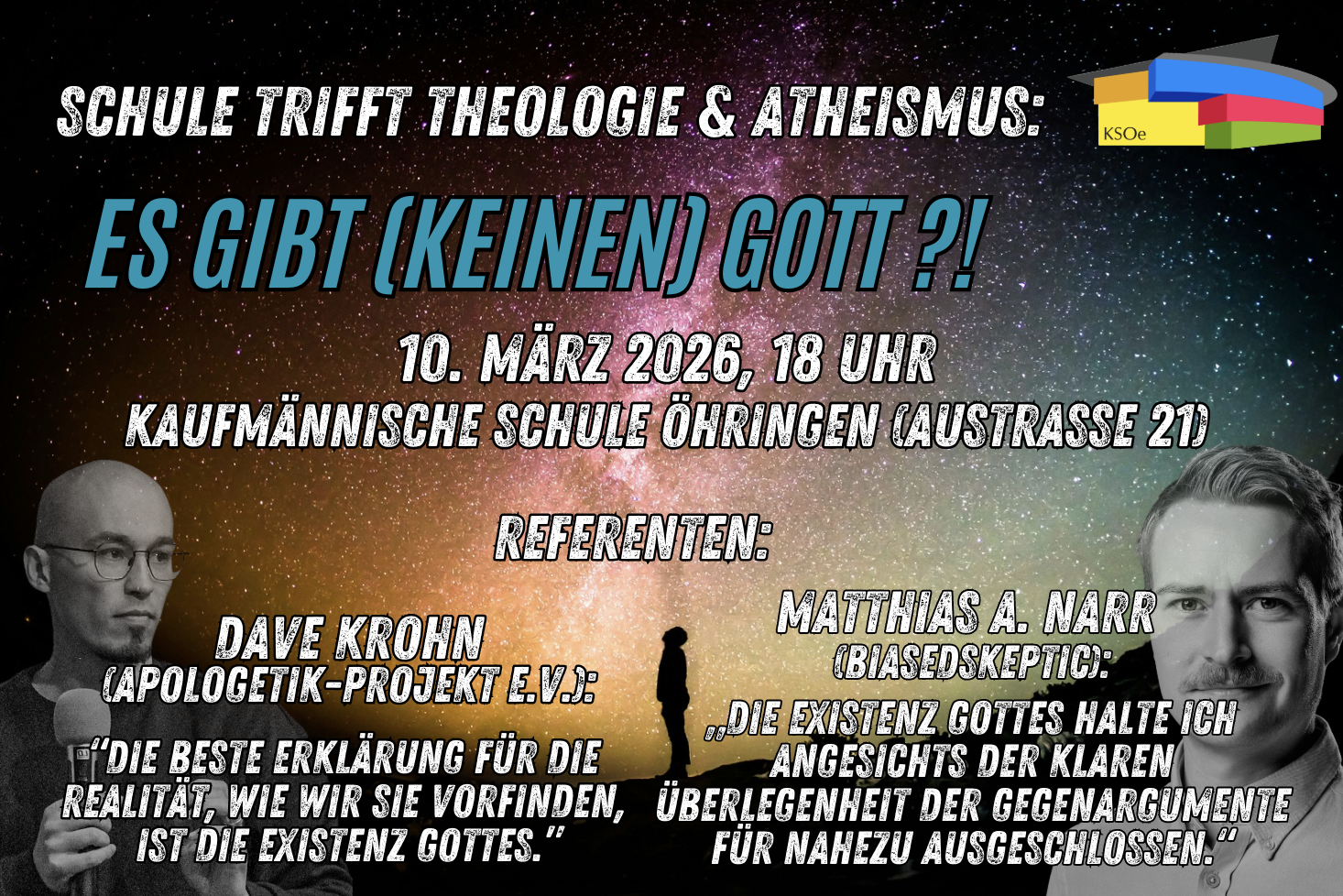 Die Religions- und Ethikfachschaft der Kaufmännischen Schule Öhringen lädt am Dienstag, 10. März um 18 Uhr ein zur Veranstaltung „Schule trifft Theologie & Atheismus: Es gibt (keinen) Gott?!!